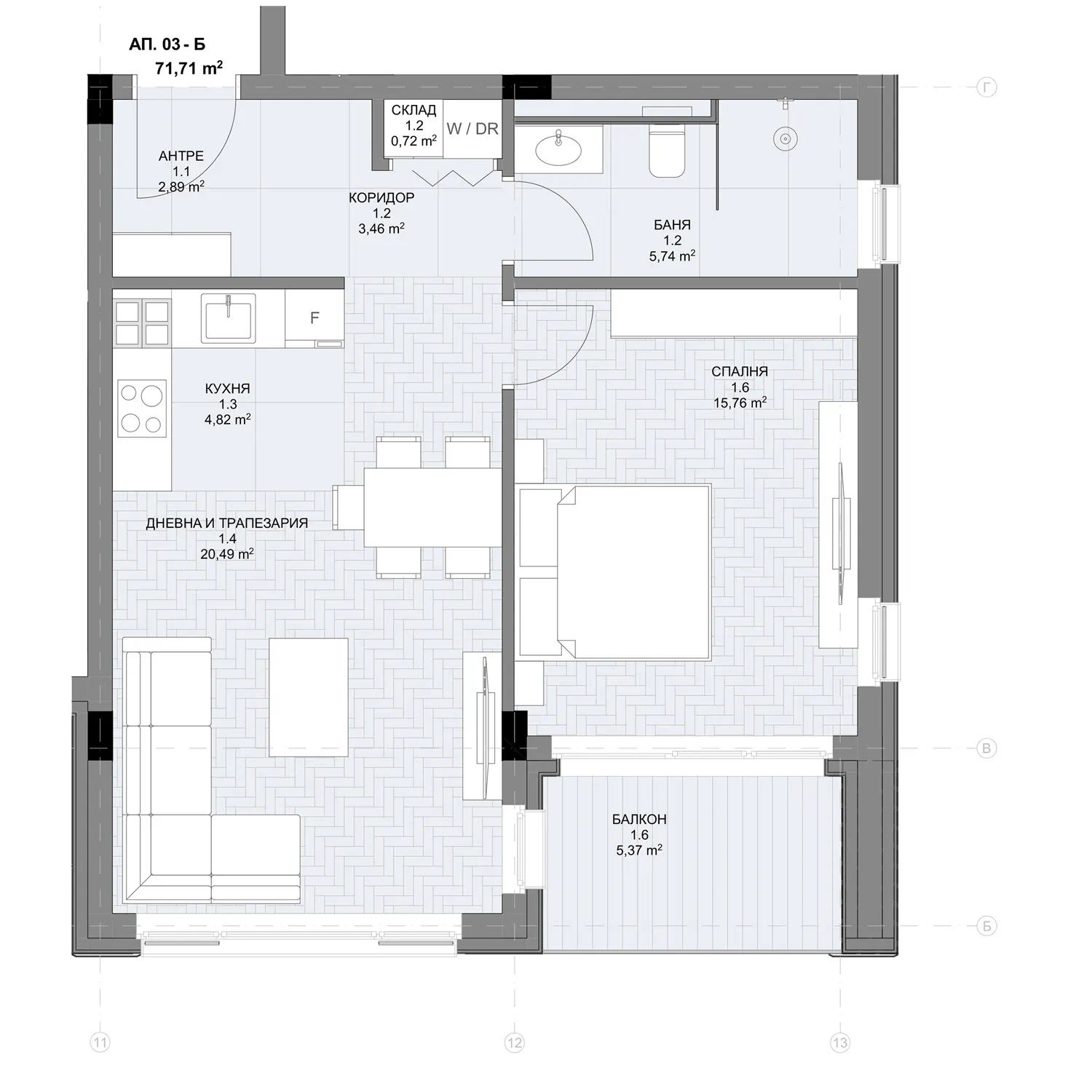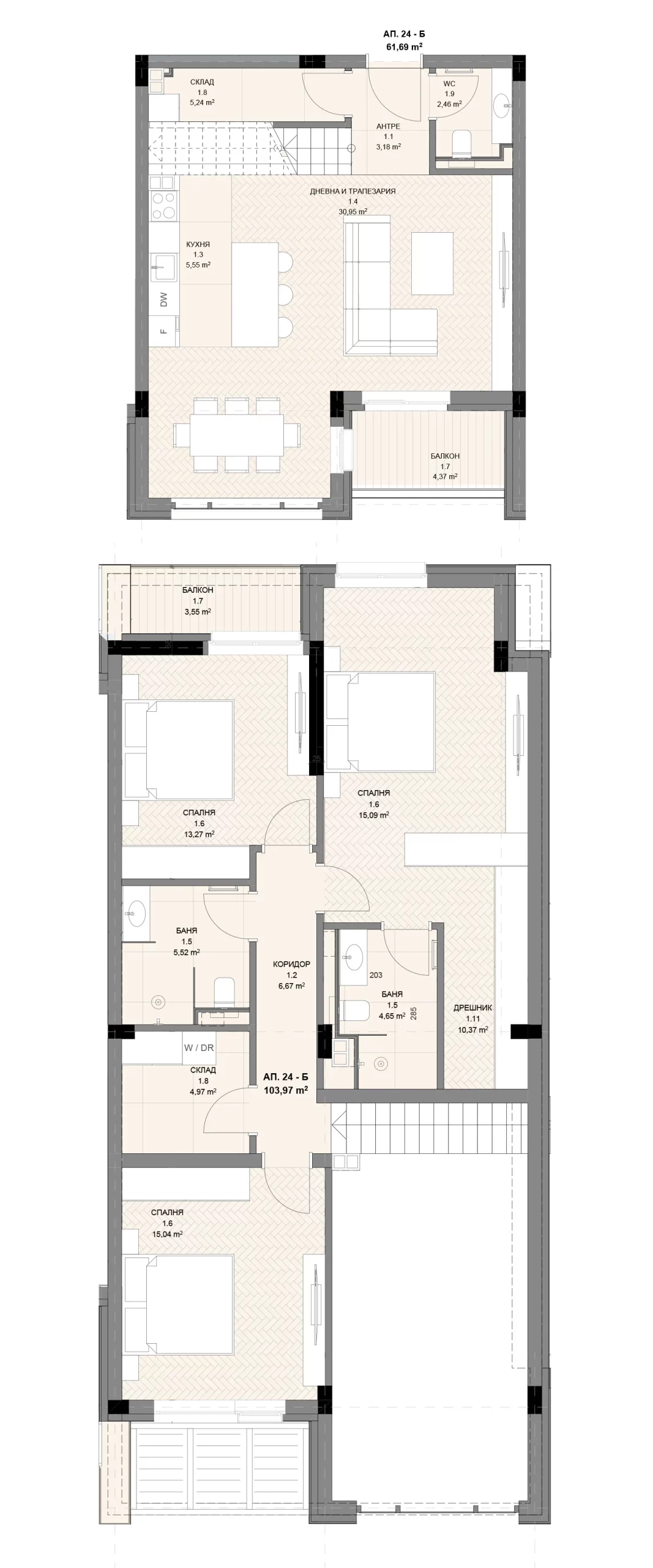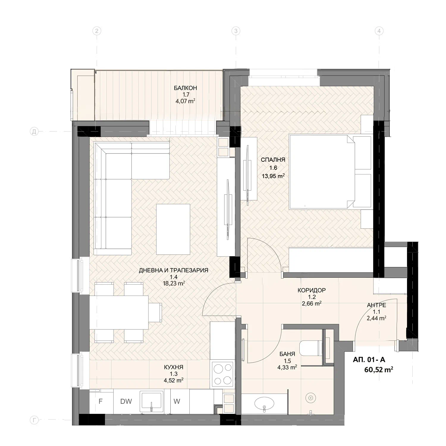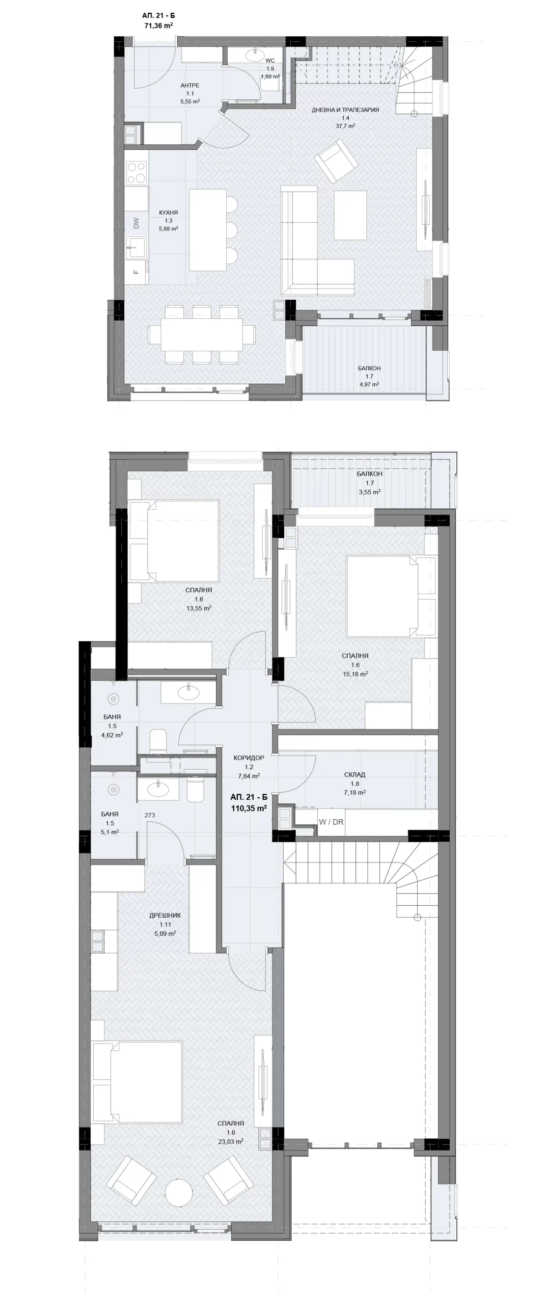 The concept of the building is centered around comfort and coziness, offering a variety of apartments – one-bedroom, two-bedroom, and multi-room apartments, as well as unique duplexes with double-height ceilings.
