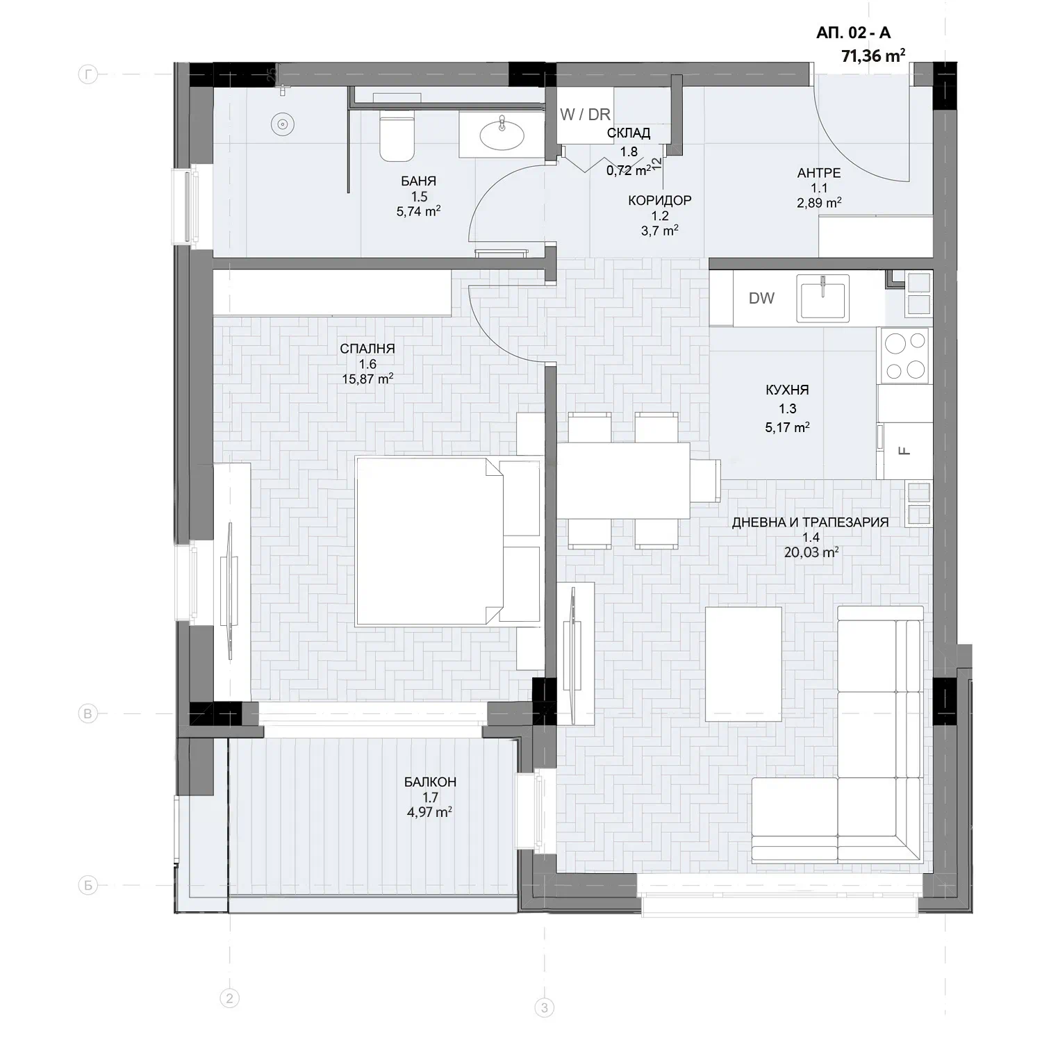Концепцията на сградата е ориентирана към комфорта и уюта, като предлага разнообразие от апартаменти – двустайни, тристайни и многостайни апартаменти, както и уникални мезонети с двойна височина на таваните.