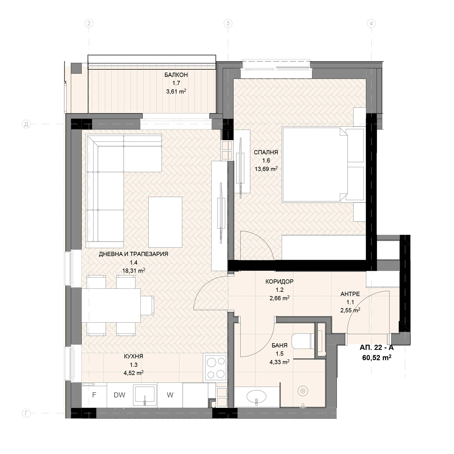 Концепцията на сградата е ориентирана към комфорта и уюта, като предлага разнообразие от апартаменти – двустайни, тристайни и многостайни апартаменти, както и уникални мезонети с двойна височина на таваните.