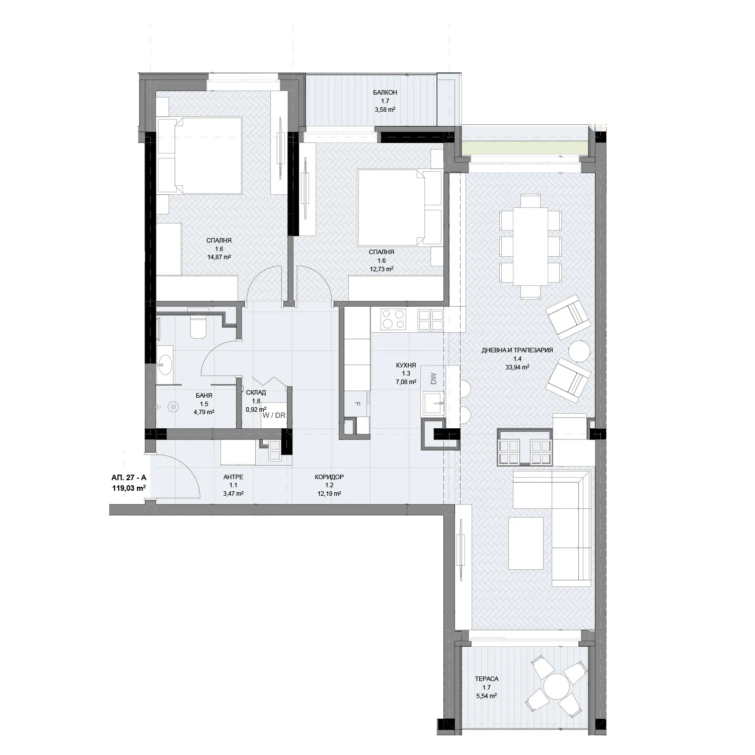 Концепцията на сградата е ориентирана към комфорта и уюта, като предлага разнообразие от апартаменти – двустайни, тристайни и многостайни апартаменти, както и уникални мезонети с двойна височина на таваните.